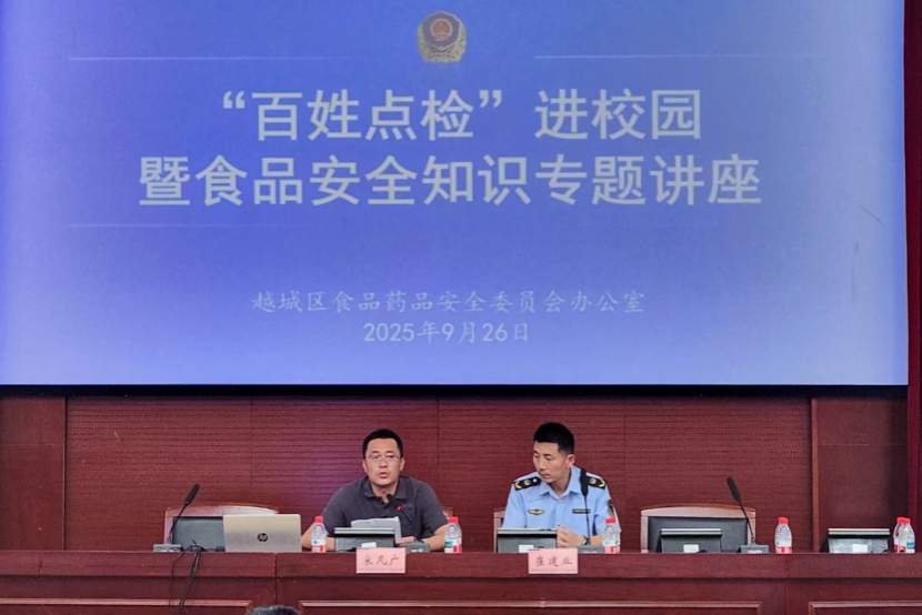 2025年9月26日下午,“尚德守法,共享食安”越城区食品安全宣传周系列活动暨“百姓点检”进校园主题活动在我校南山校区教育与心理学院报告厅举行。区市场监督管理局行政执法队专职副队长崔建业与食品安全领域专家、我校餐饮从业人员及学生代表等150余人共同参与。活动由后勤管理处副处长宋凡广主持。